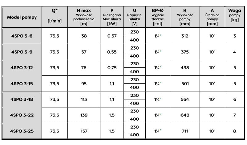 Pompy głębinowe SPO jako jedyne z niewielu dostępnych na rynku pomp wykonane są w całości ze stali nierdzewnej co gwarantuje wieloletnią niezawodność. Zakres parametrów i mocy silnika pomp głębinowych SPO pozwala w pełni zaspokoić każdą indywidualną potrzebę klienta- nawet najbardziej niestandardową. Ze względu na wykonanie materiałowe moga być wykorzystywane jako pompy ciepła. Pompy SPO najczęściej są wykorzystywane przy zaopatrzeniu w wodę domów jedno i wielorodzinnych, działki rekreacyjne, ogrodnictwo, rolnictwo, przemysł, wodociągi miejskie, przedsiębiorstwa komunalne. Ze względu na bezobsługową i bezawaryjną pracę, jest bardzo ceniona wśród studniarzy i monterów.